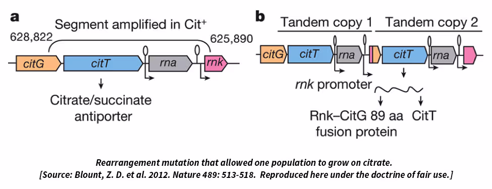 - Another population evolved the ability to use a second carbon source, called citrate, which neither the ancestor nor any of the other lineages can use; the citrate is in the medium as a chelating agent, and coli can’t normally grow on it.